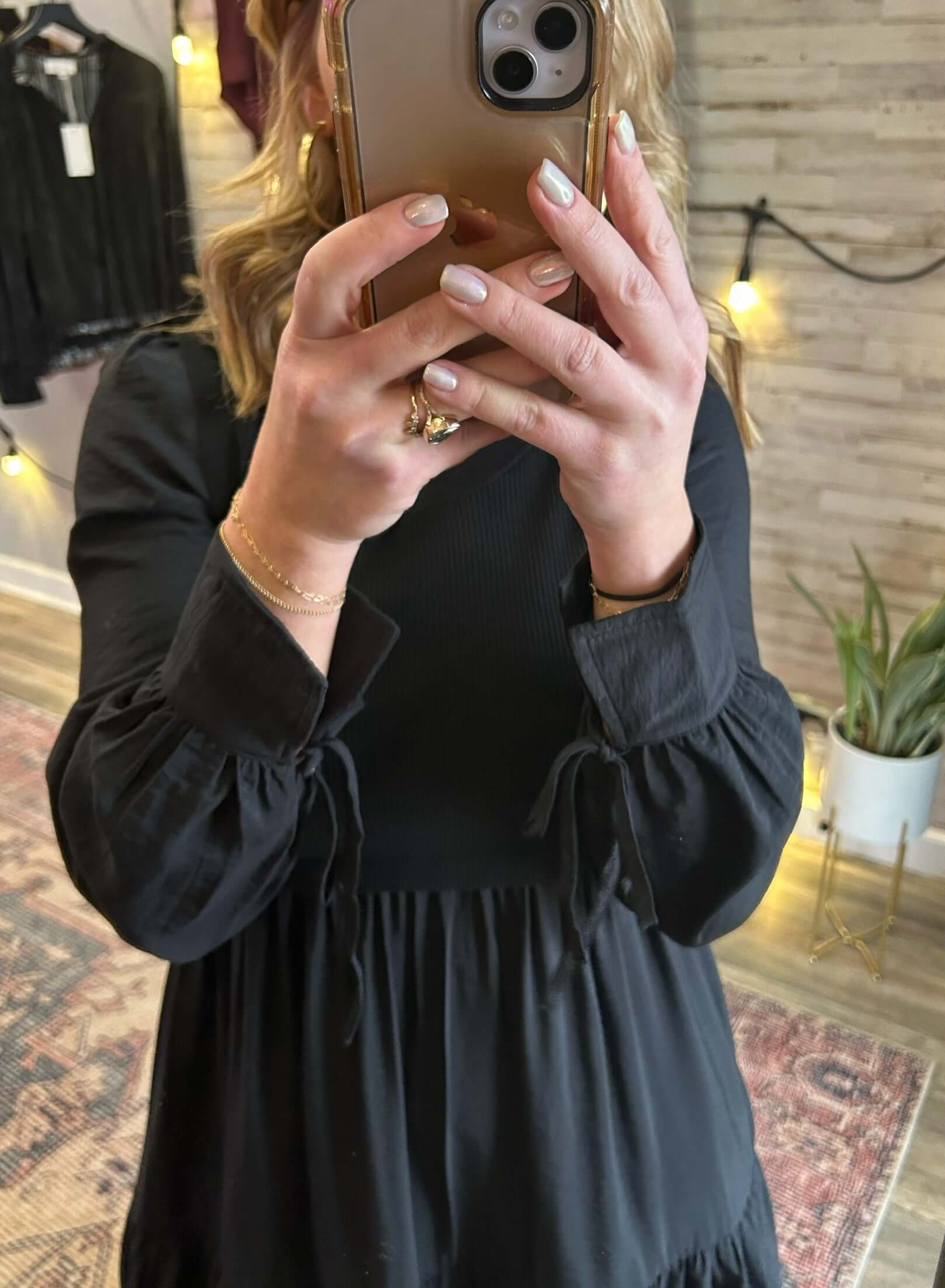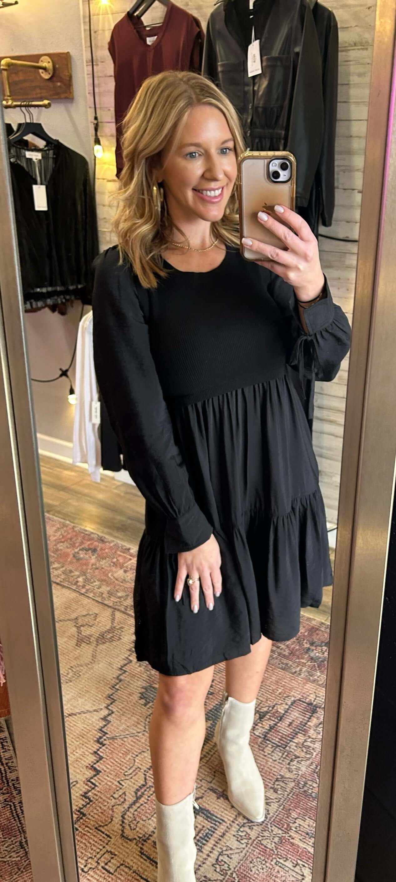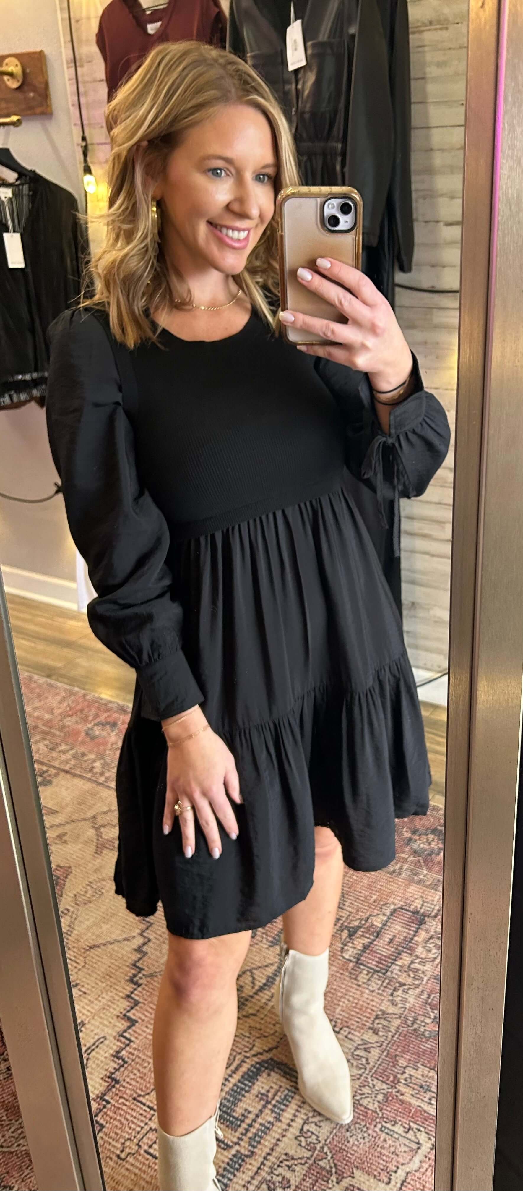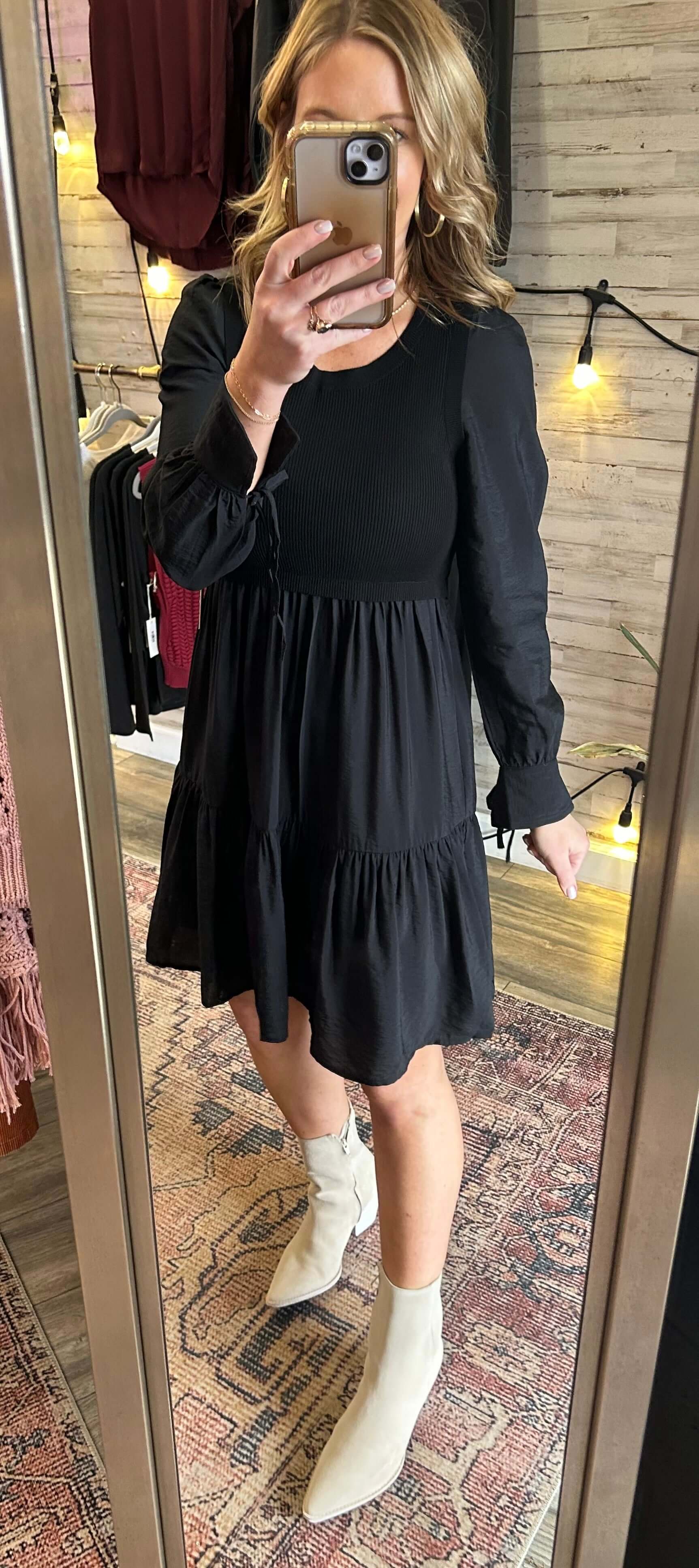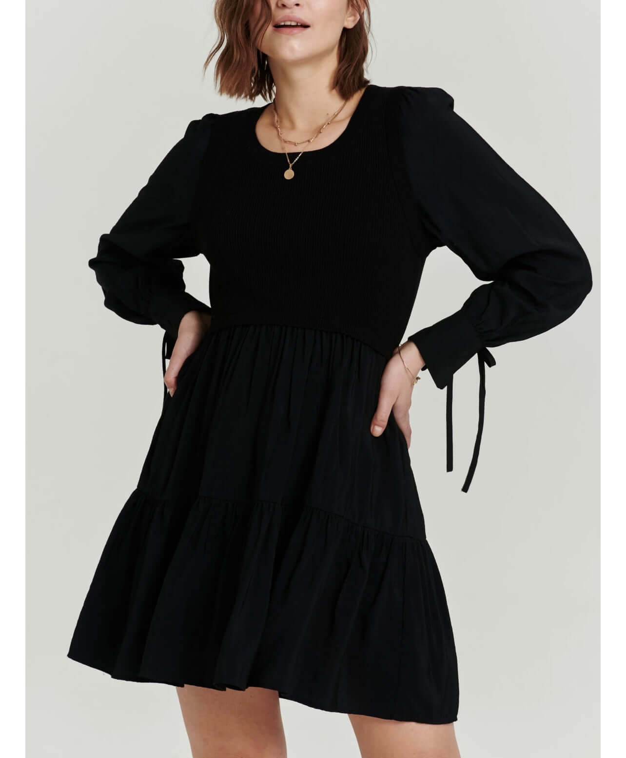 Two fer mix media midi dress, long sleeve scoop neck with bands, finished with cuffs with ties & tier skirt. Brilliant artistry of details & materials, original look speaking with charms & charismas... Solid color woven on standard fit.