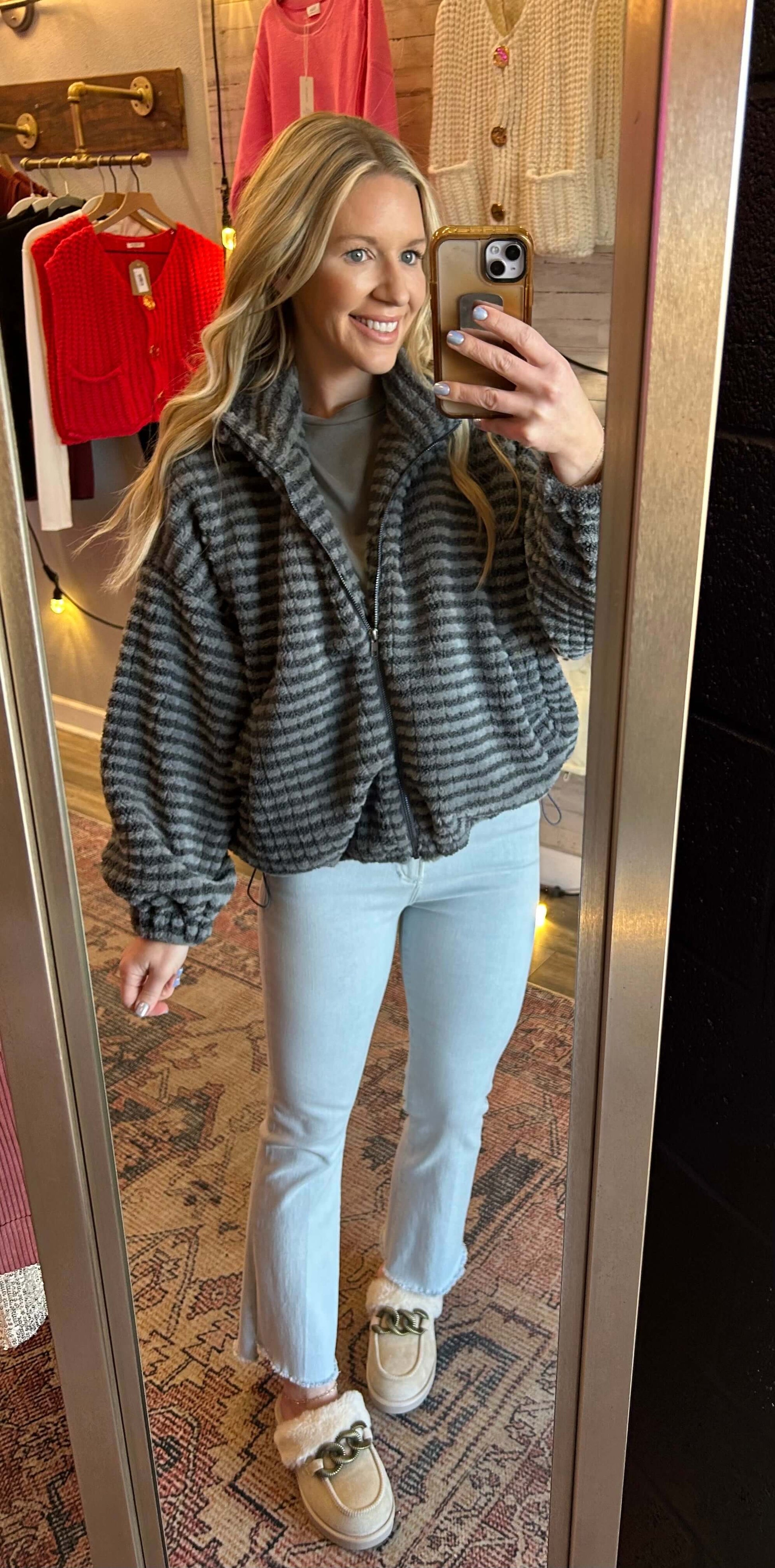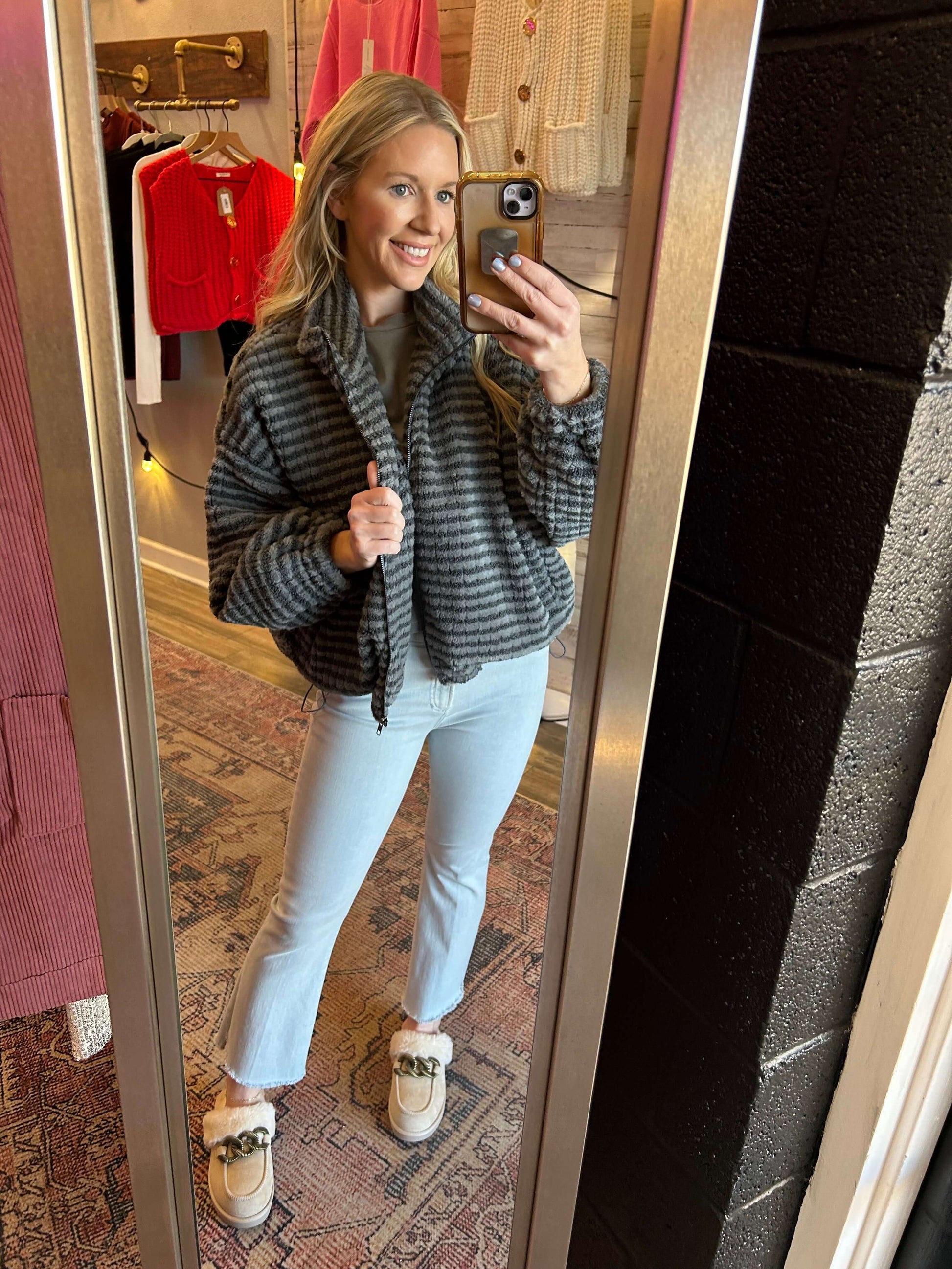 The perfect chenille bomber jacket to dress up or down !! Has cinch waist details to make it as fitted as you would like ! Small pictured