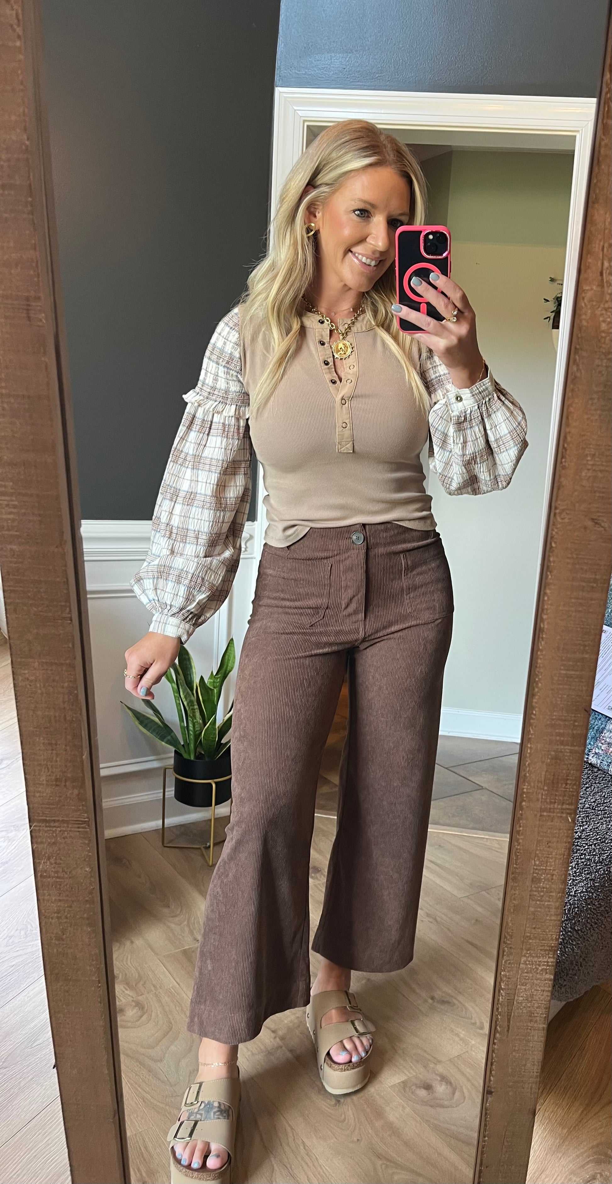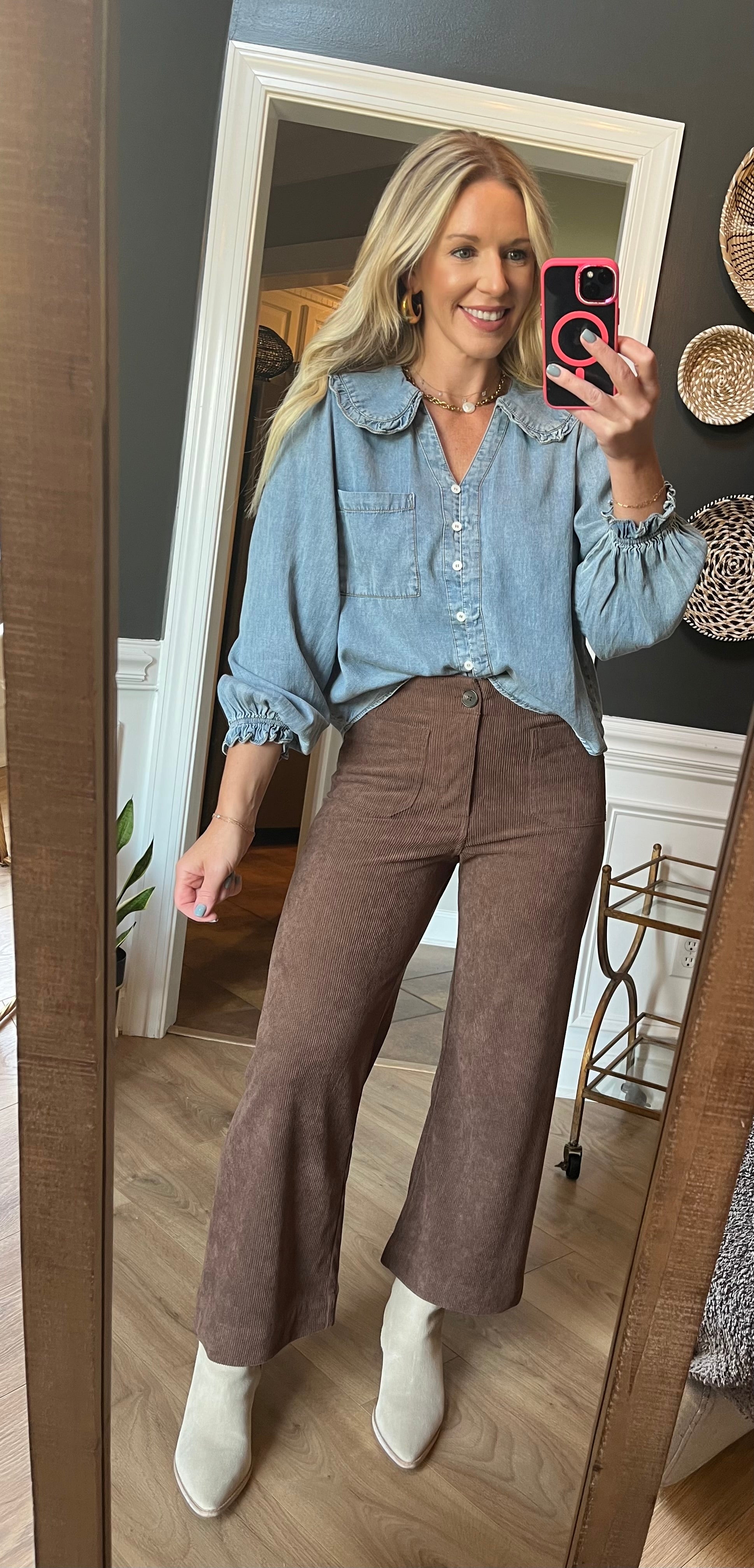 The perfect wide leg crop cord pants for fall! Dress them up with boots or down with your fav clogs ! They zip and button in the front , patch pocket on front and back pockets