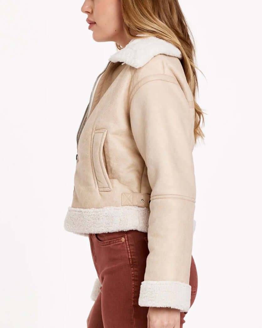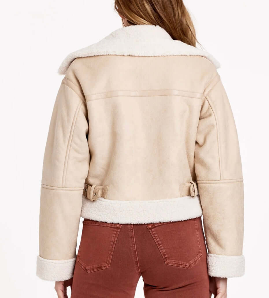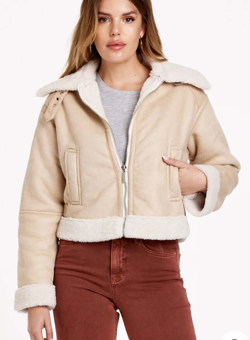Beige sherpa lined suede jacket. Metal zipper front closure, long sleeve finished with seam piping, side welt pockets, neck & tab belts. Solid color woven on relaxed fit.
