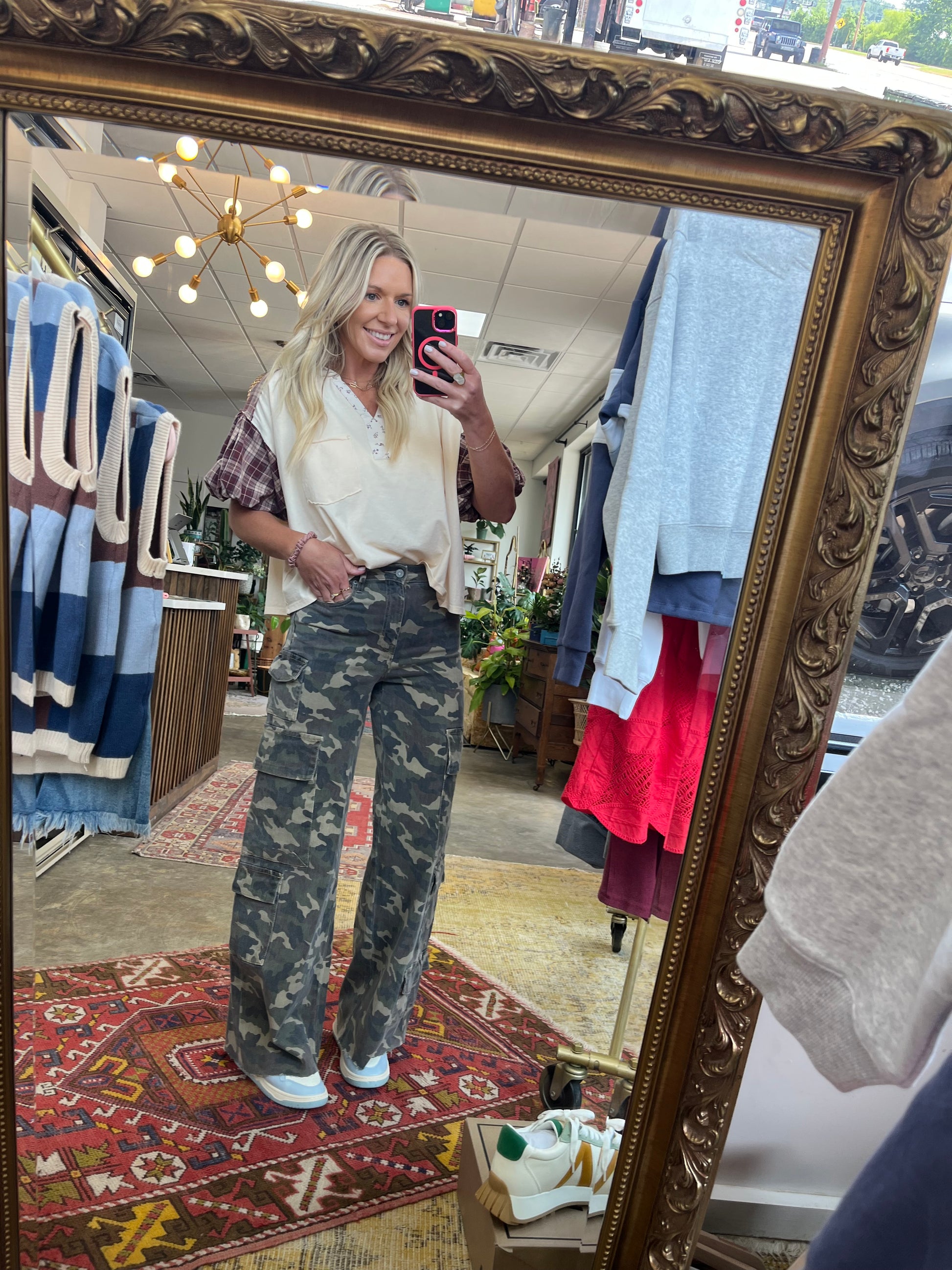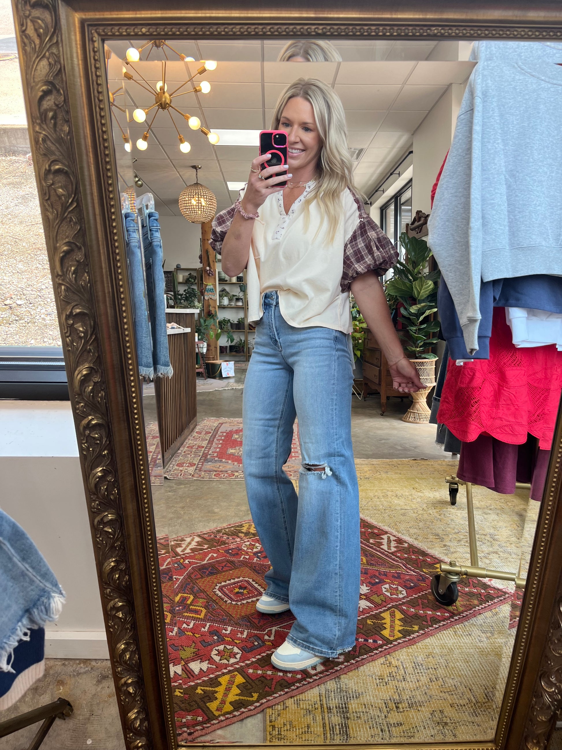 Floral Trim Plaid Sleeve Top
