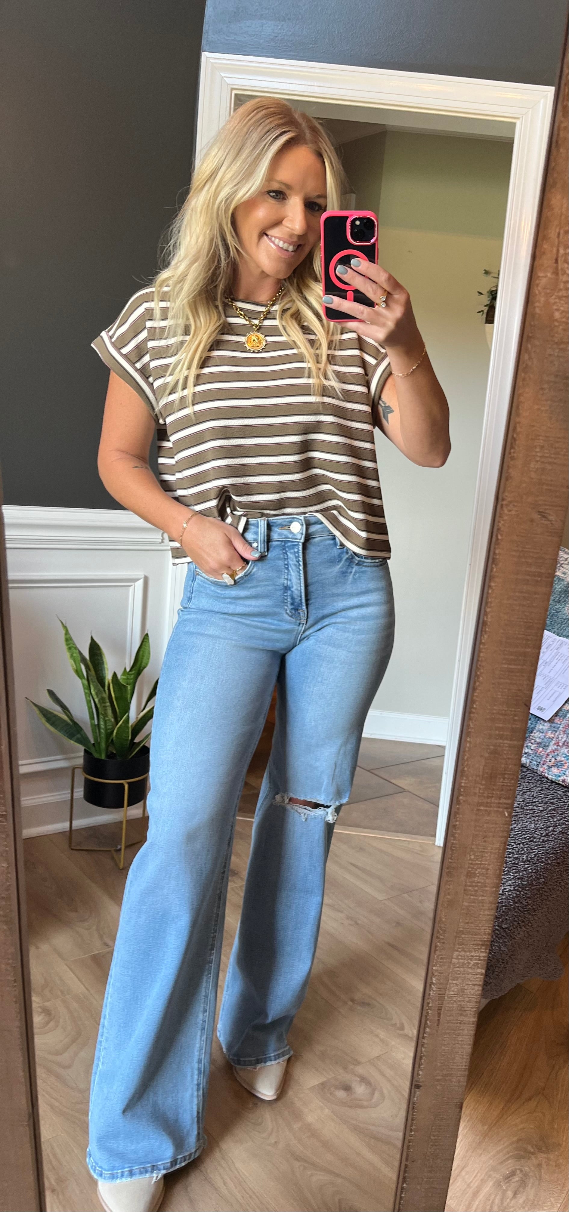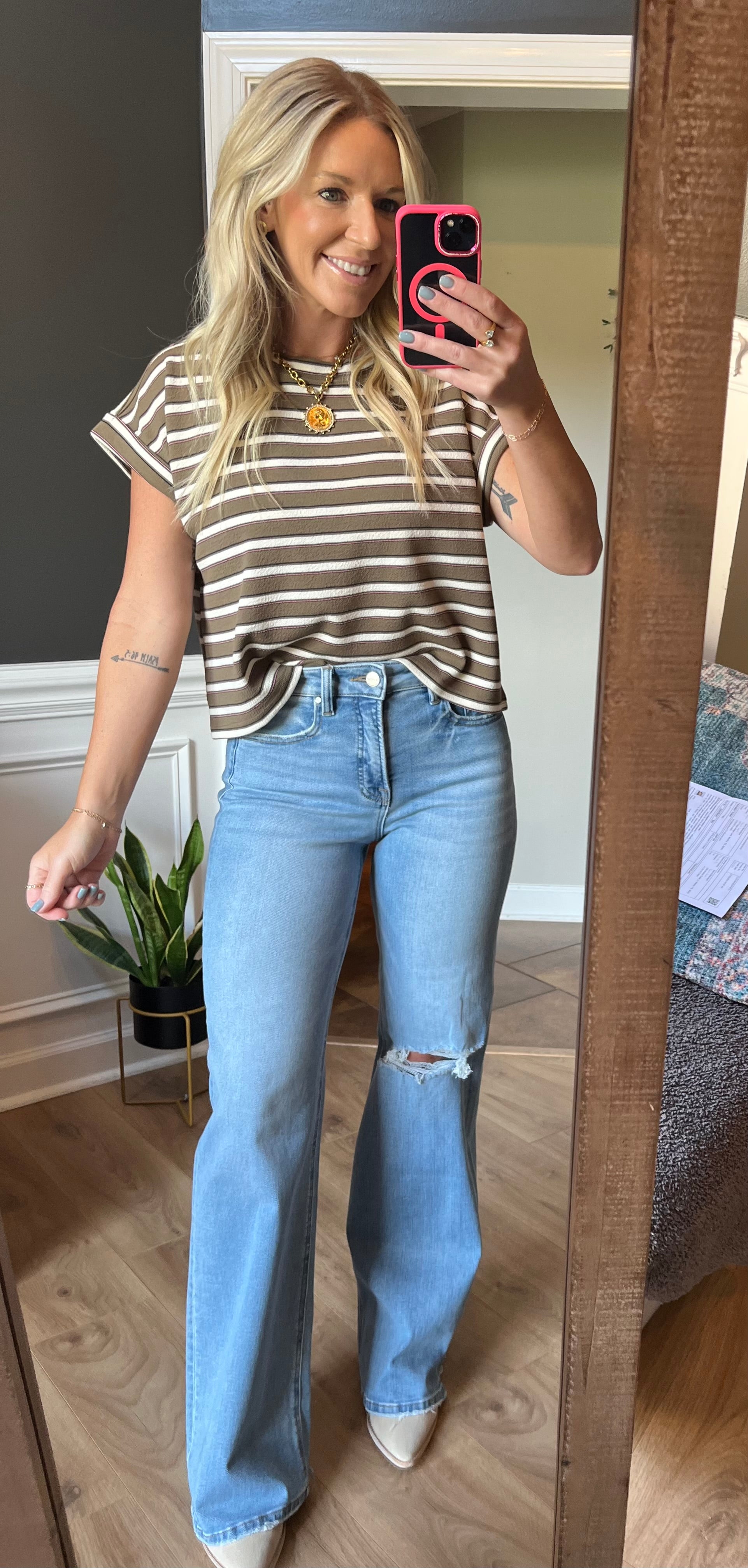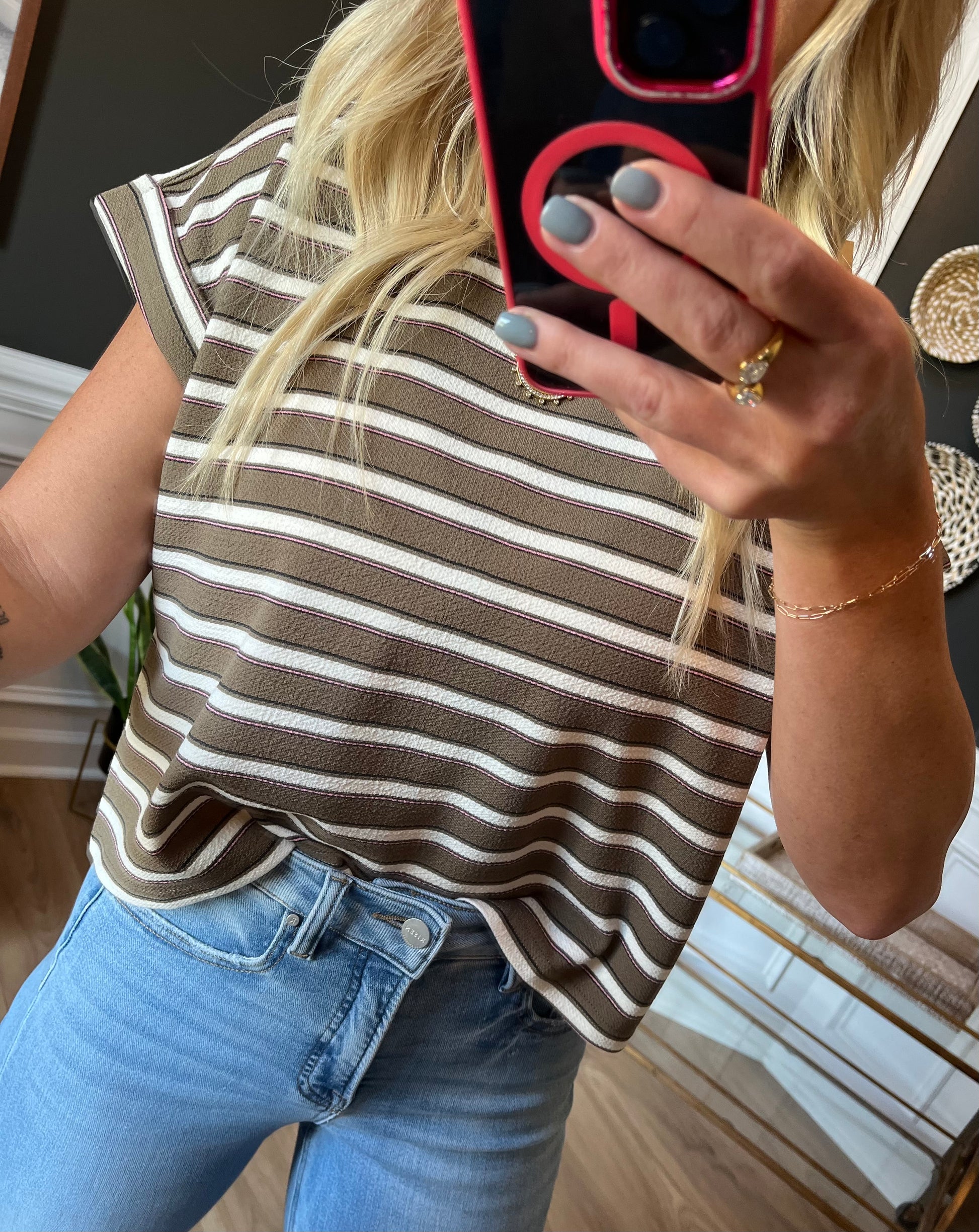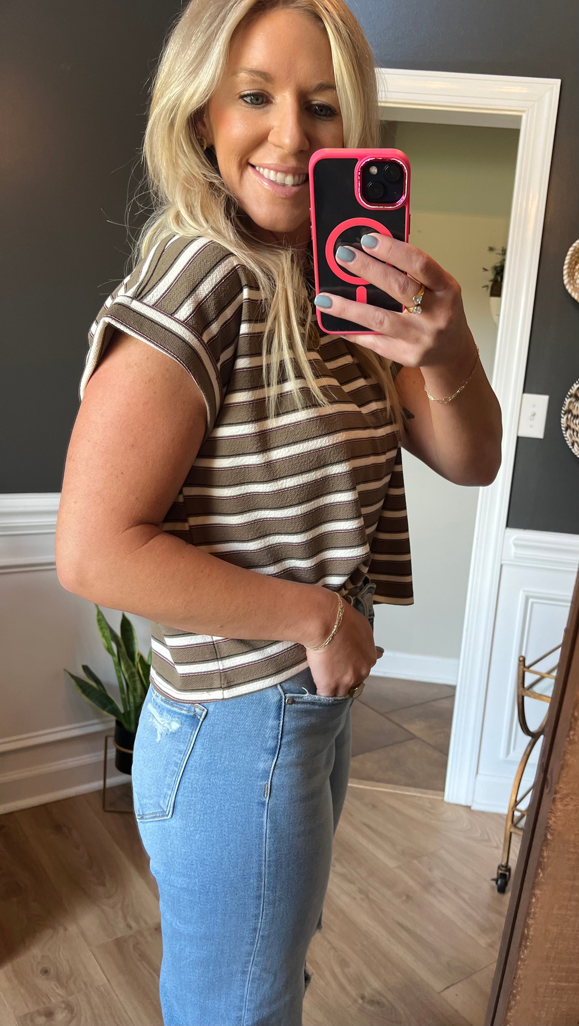Love a good olive mocha mix for fall!! This top has cream striped detail with a pink stitched line to accent !! Perfect to throw on and go with your fav jeans for an elevated look!