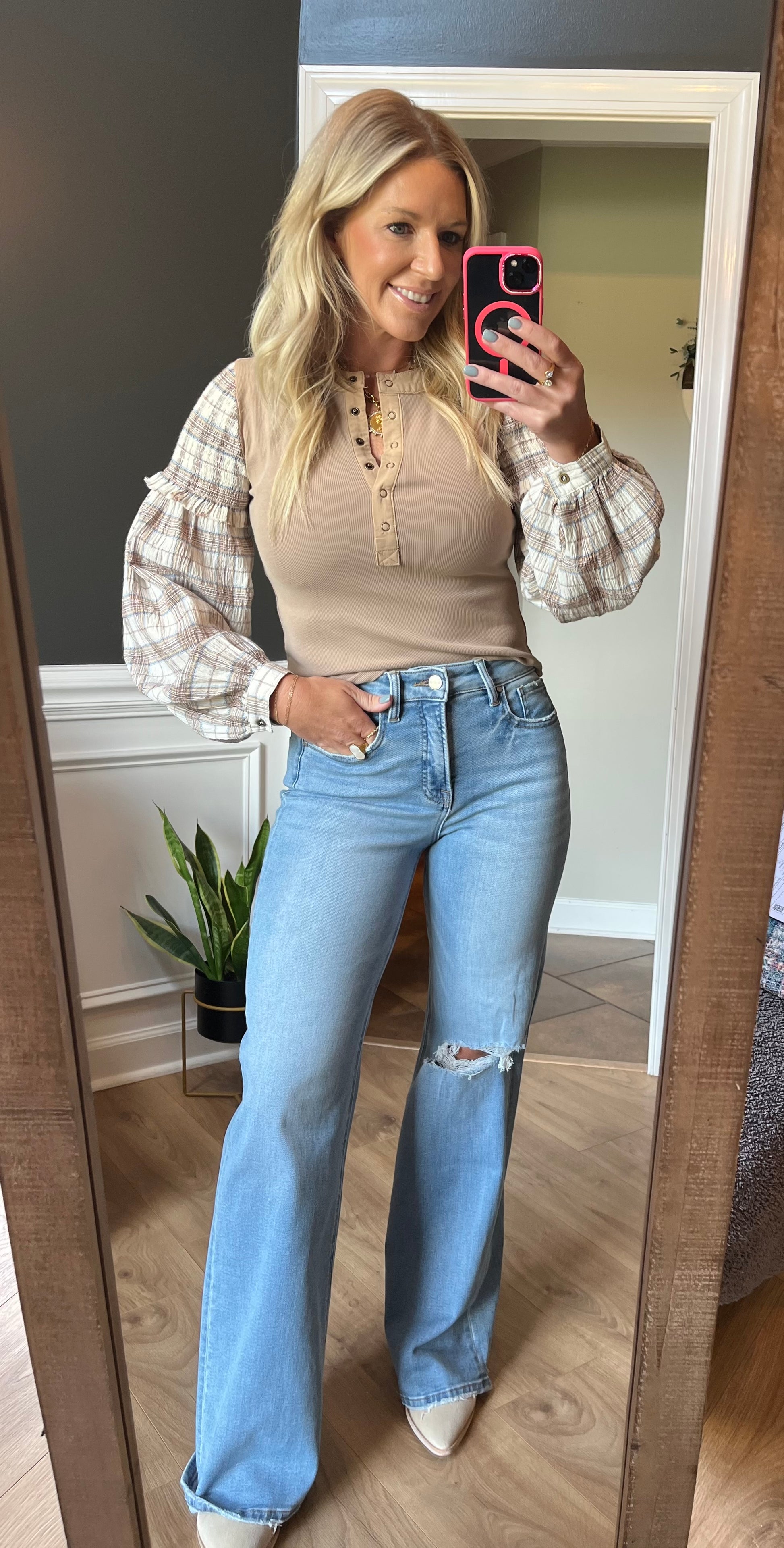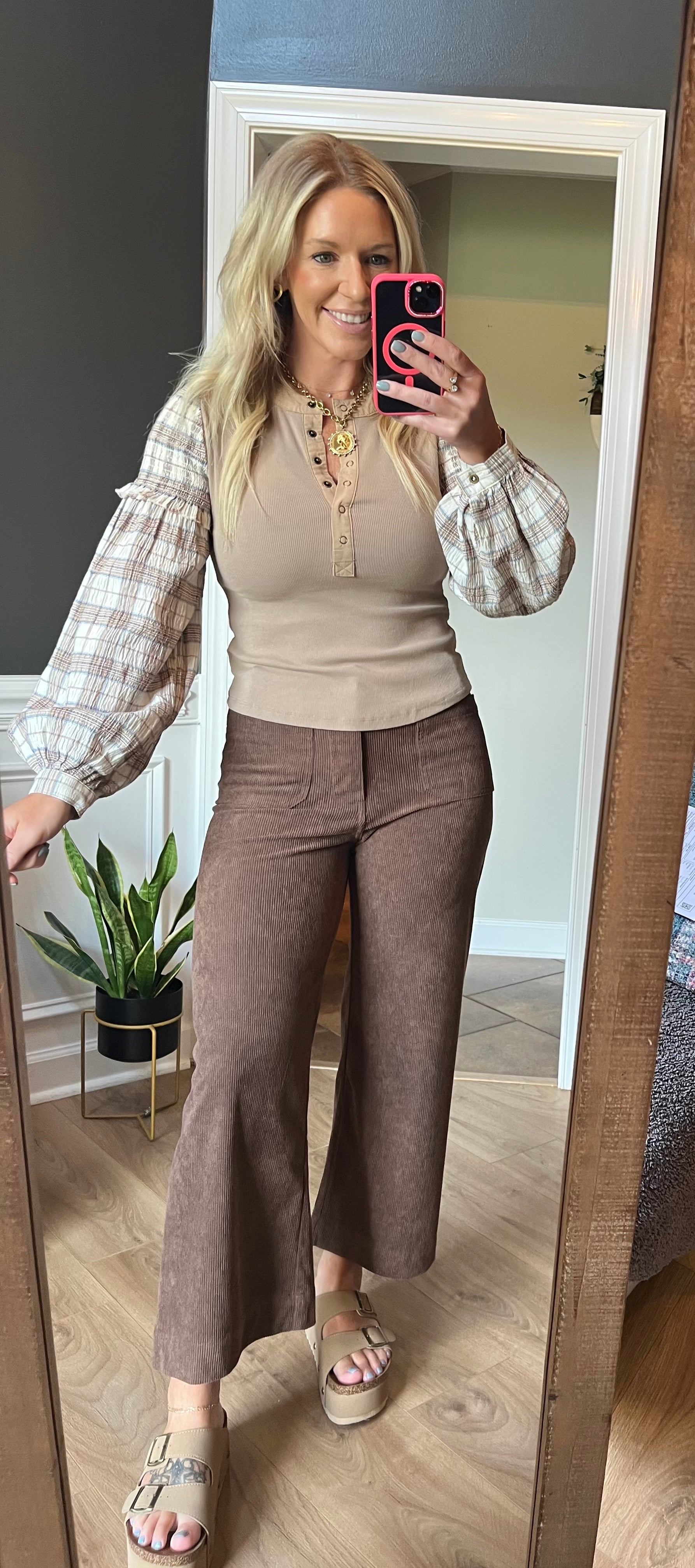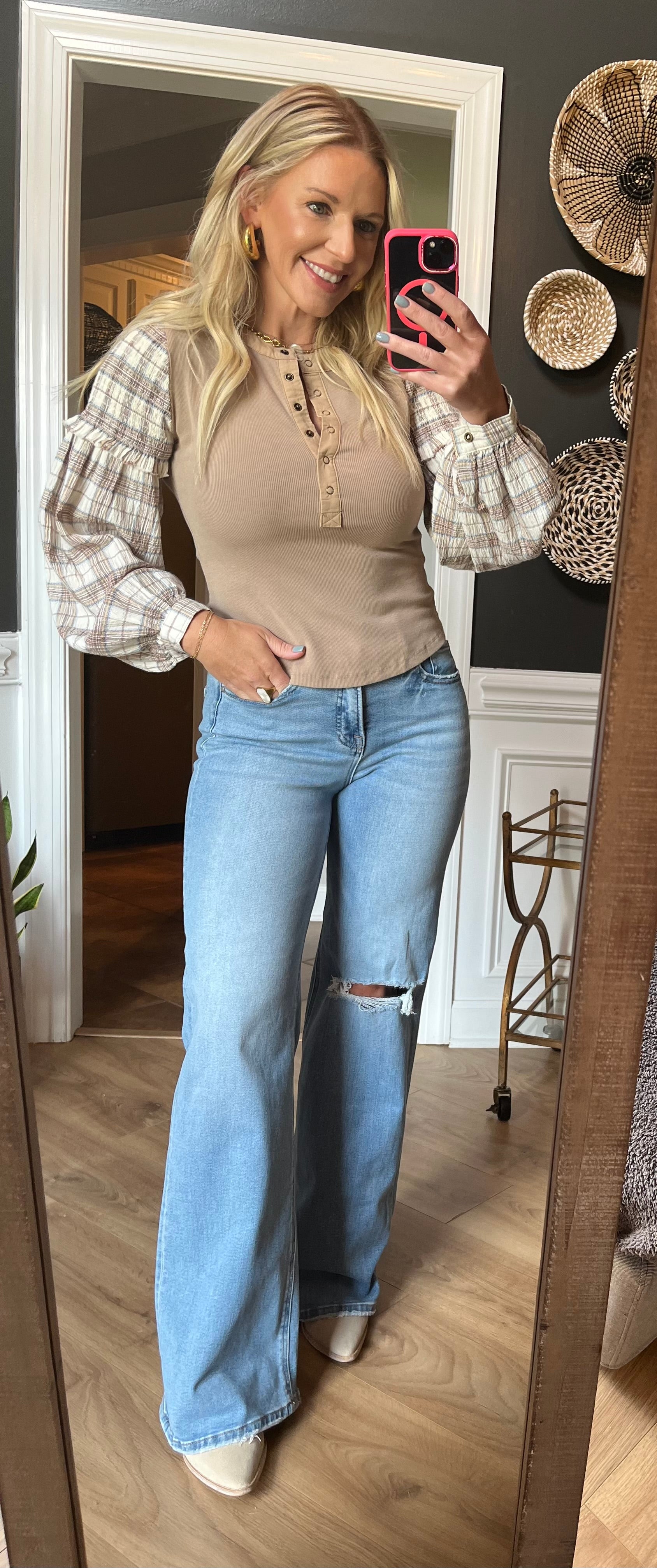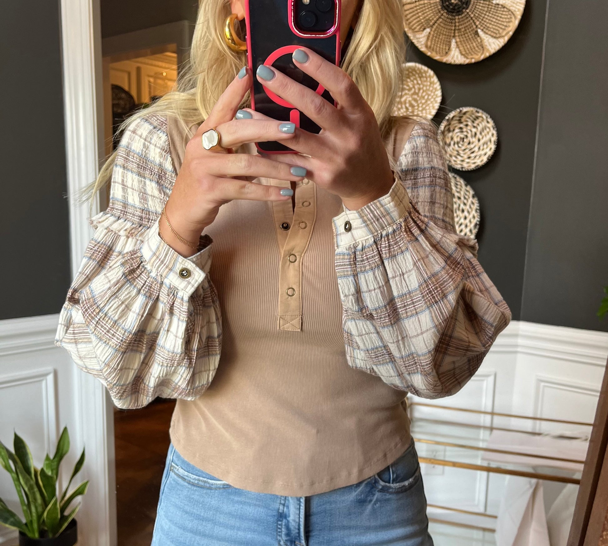 Plaid but make it chic! Obsessed with our new ribbed Henley mocha top , button down v neck details. Super light weight plaid balloon sleeve
