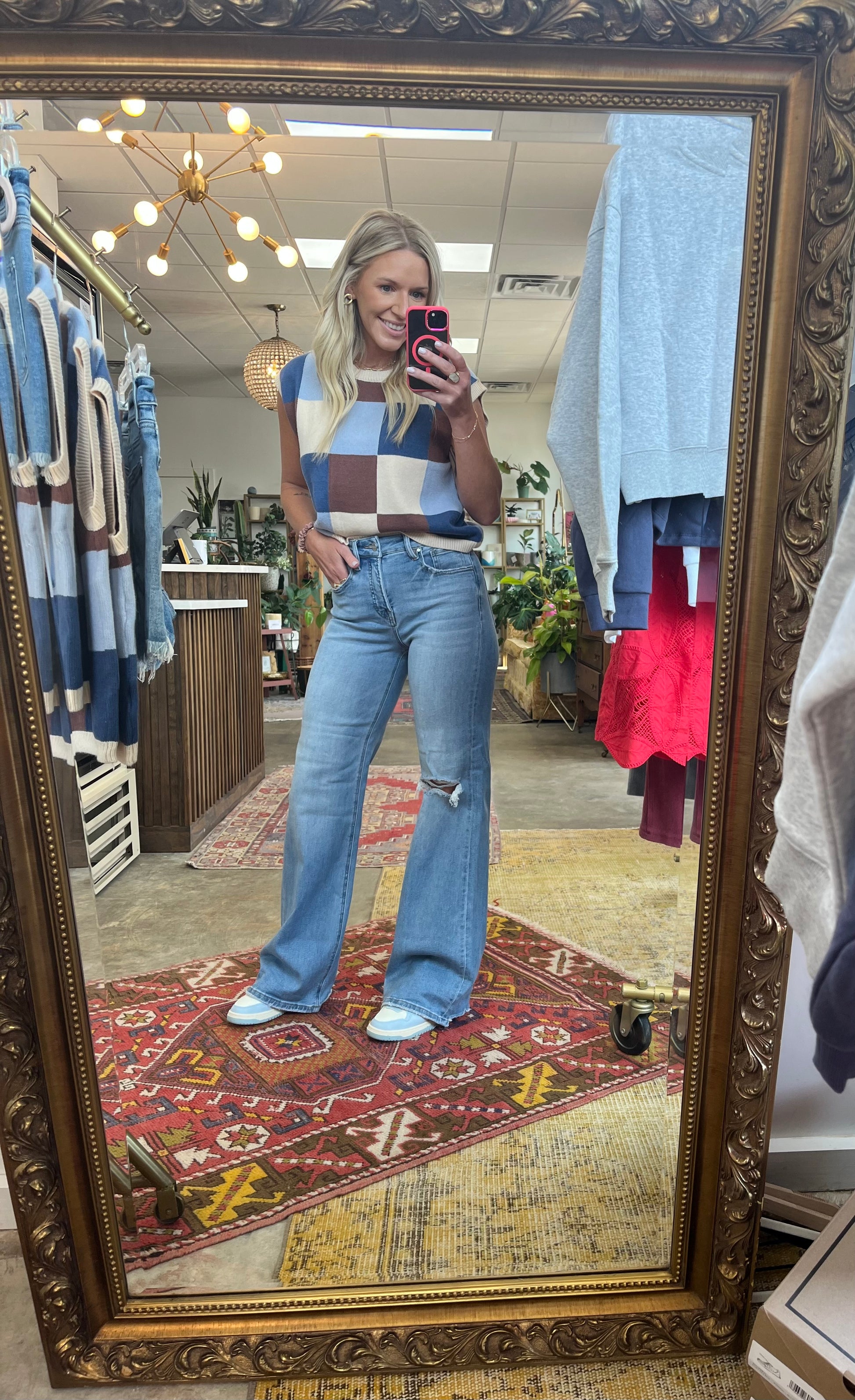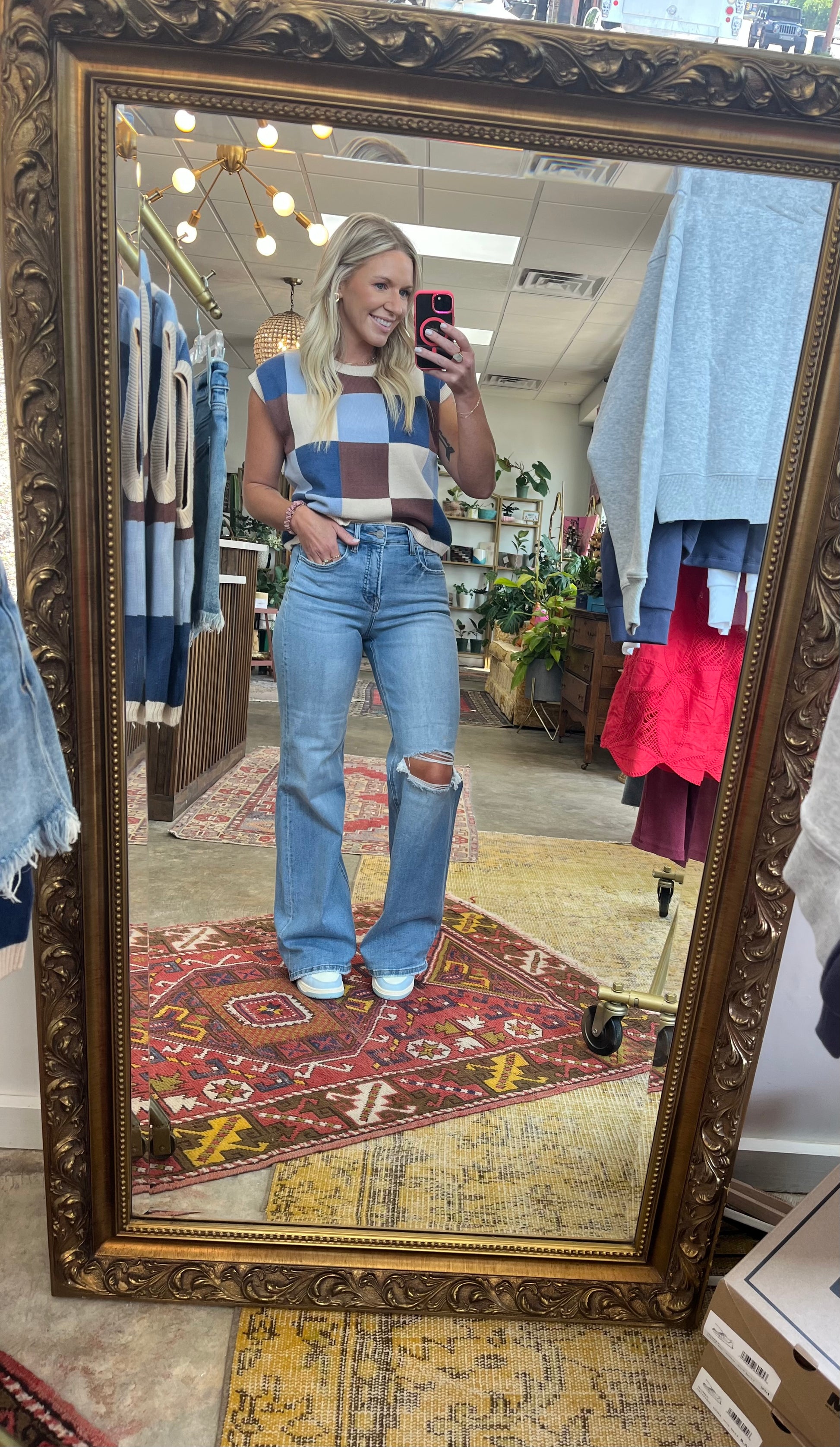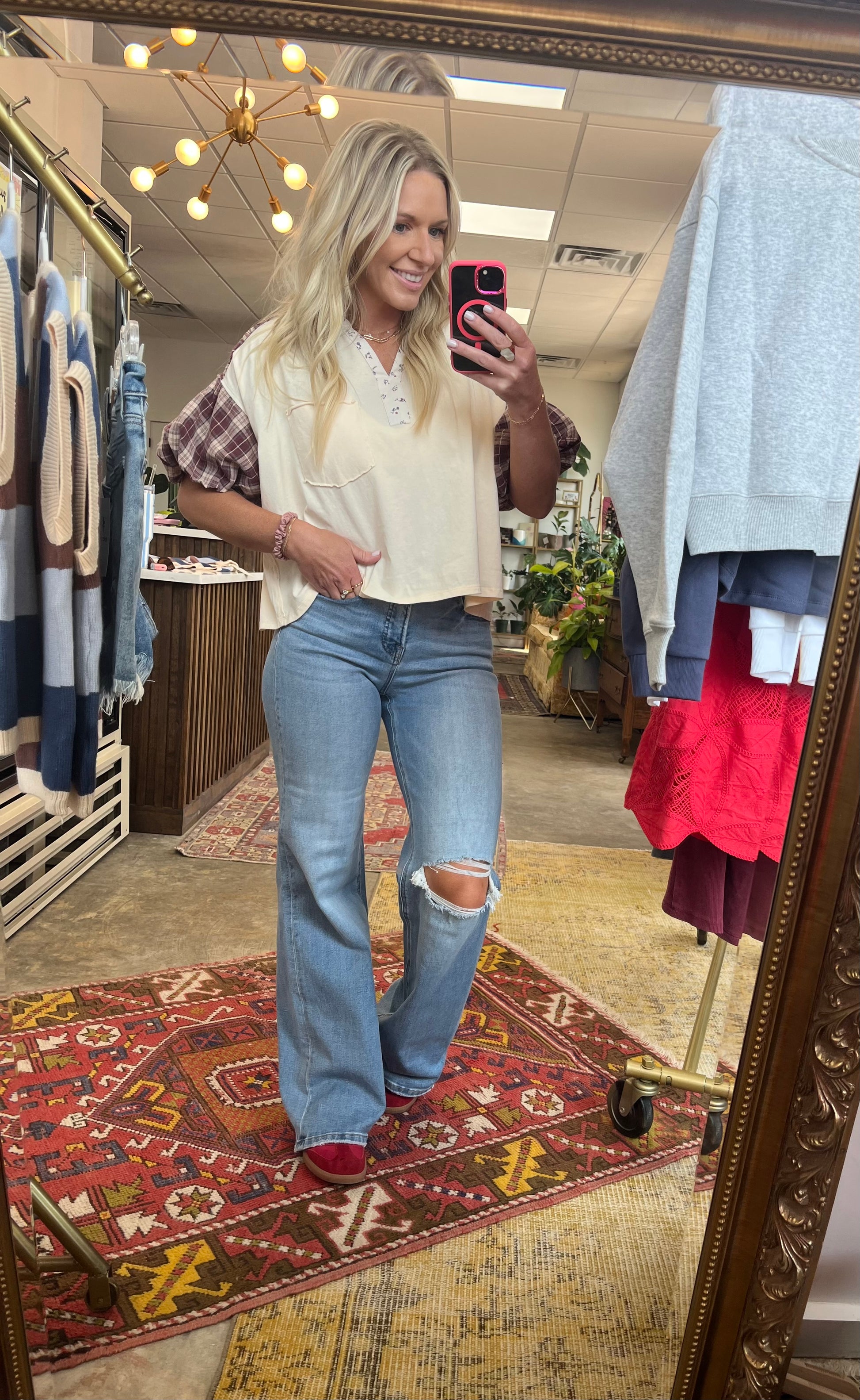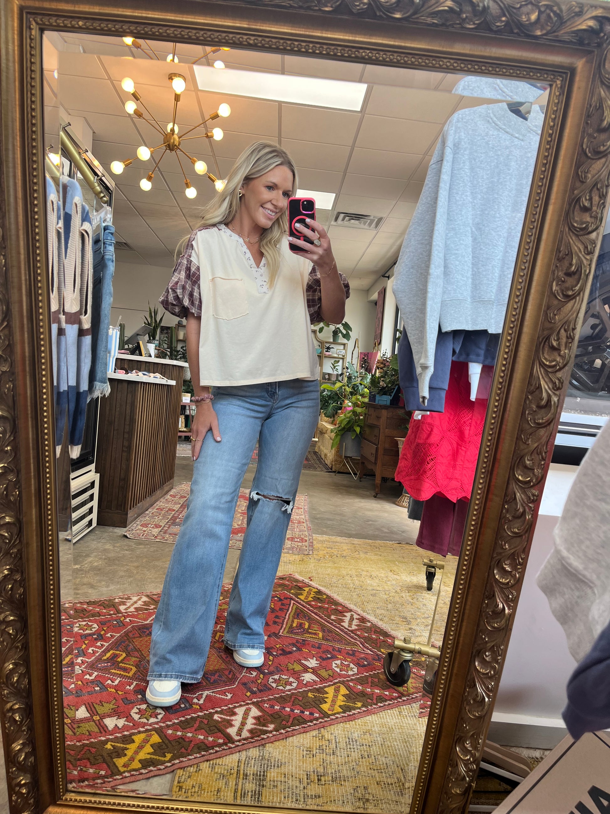 The best transitional jeans into fall! One knee split detail, stretchy and high rise