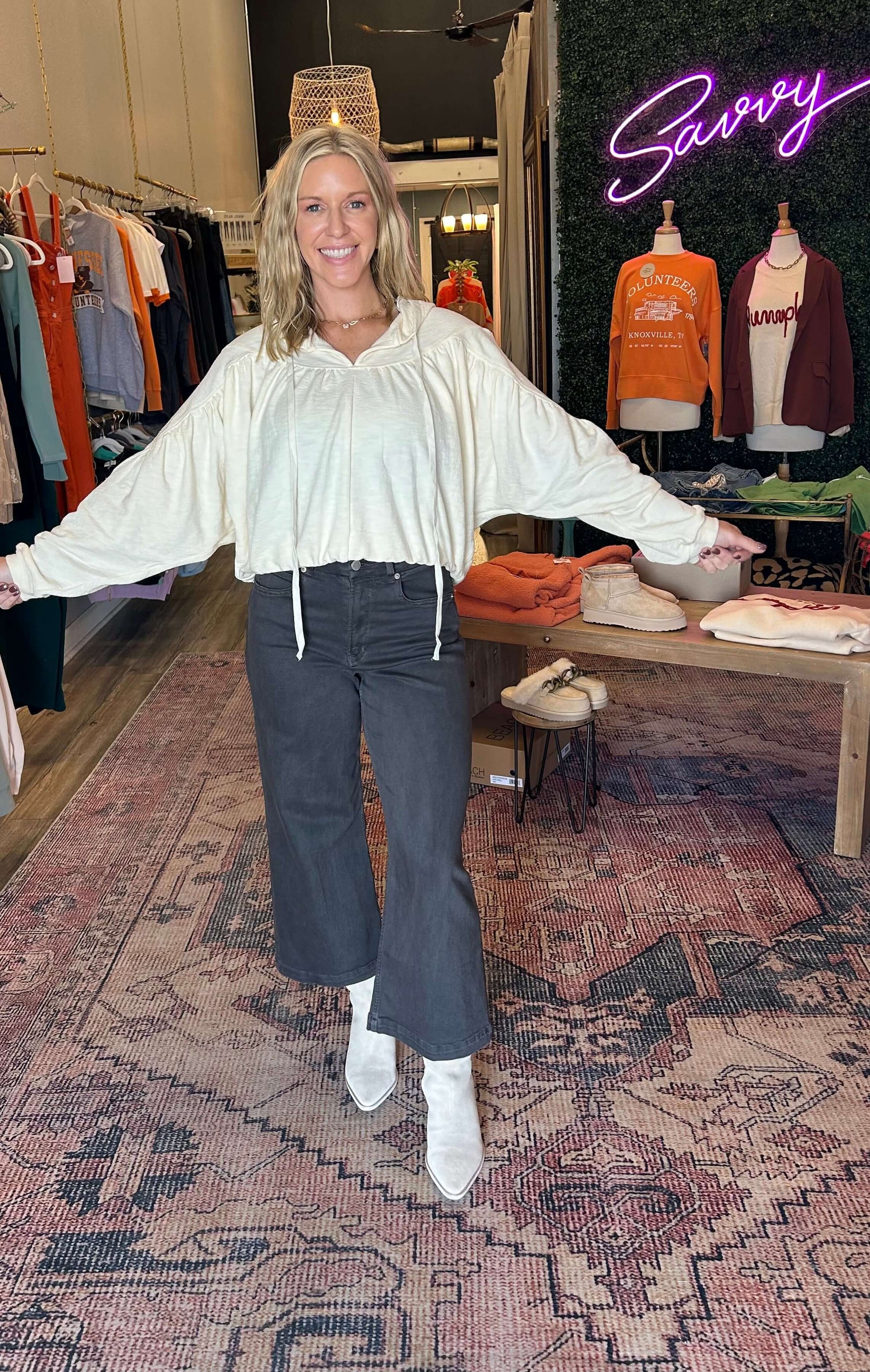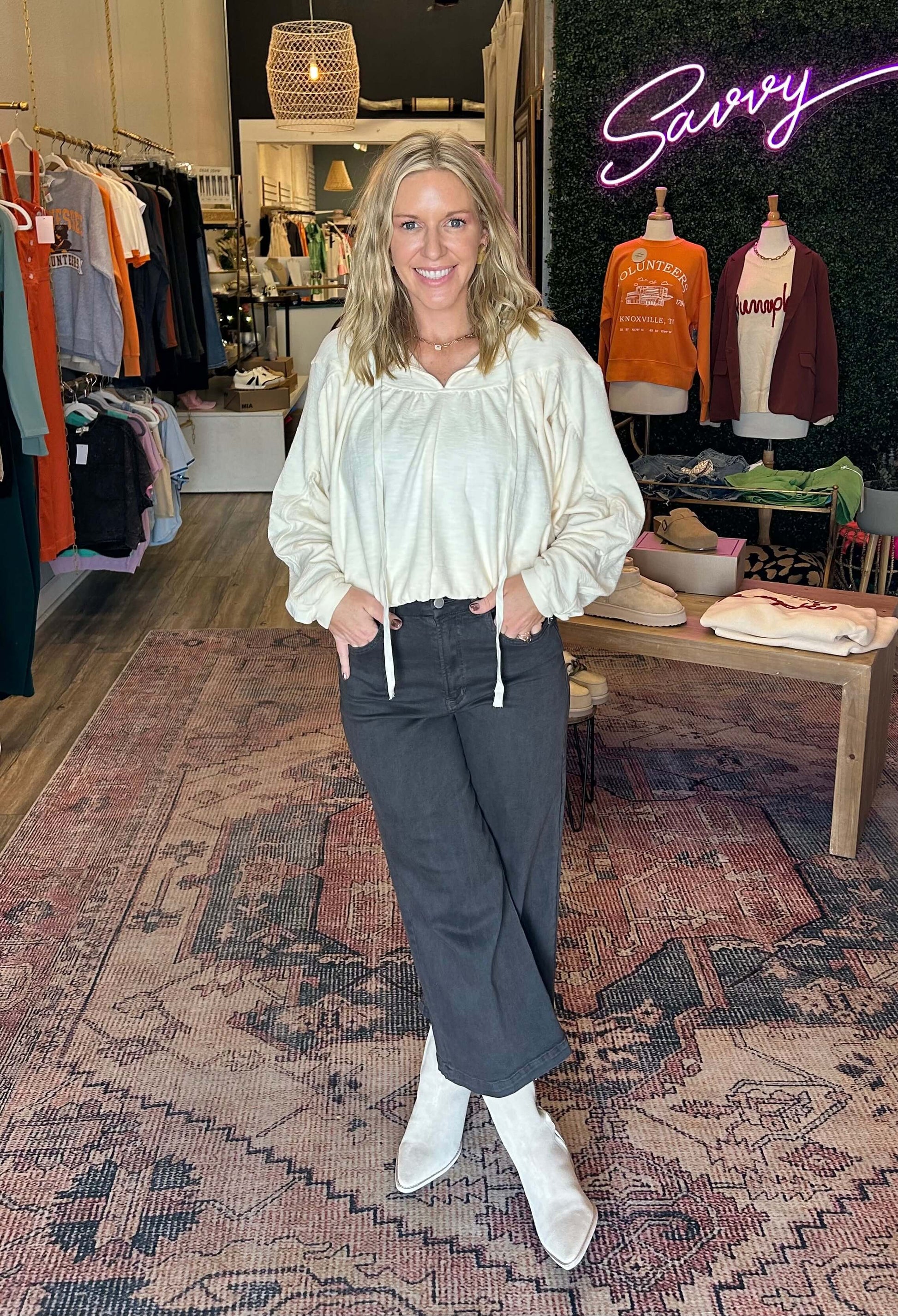 Textured Balloon Sleeve Shirring Detail Top/ cream