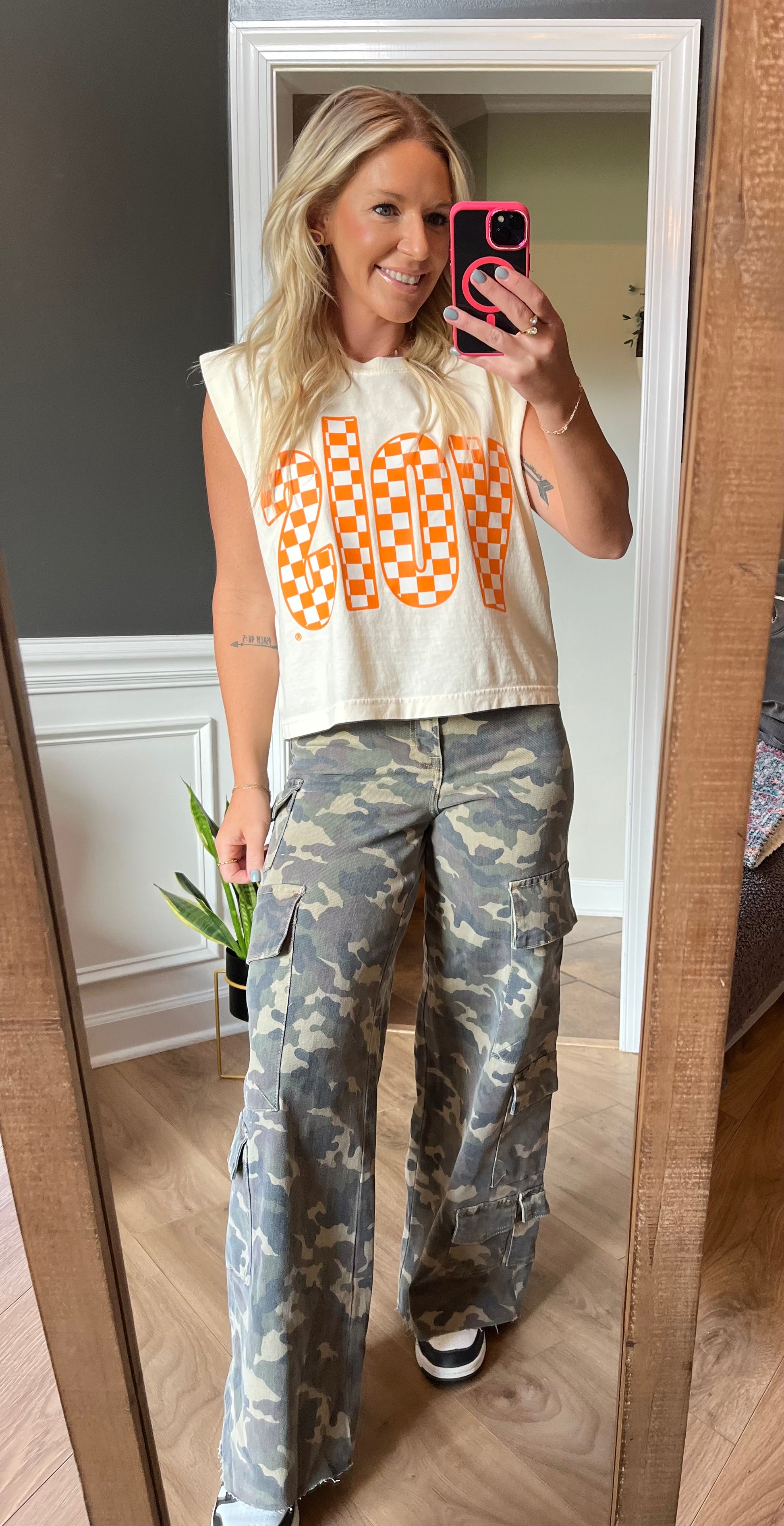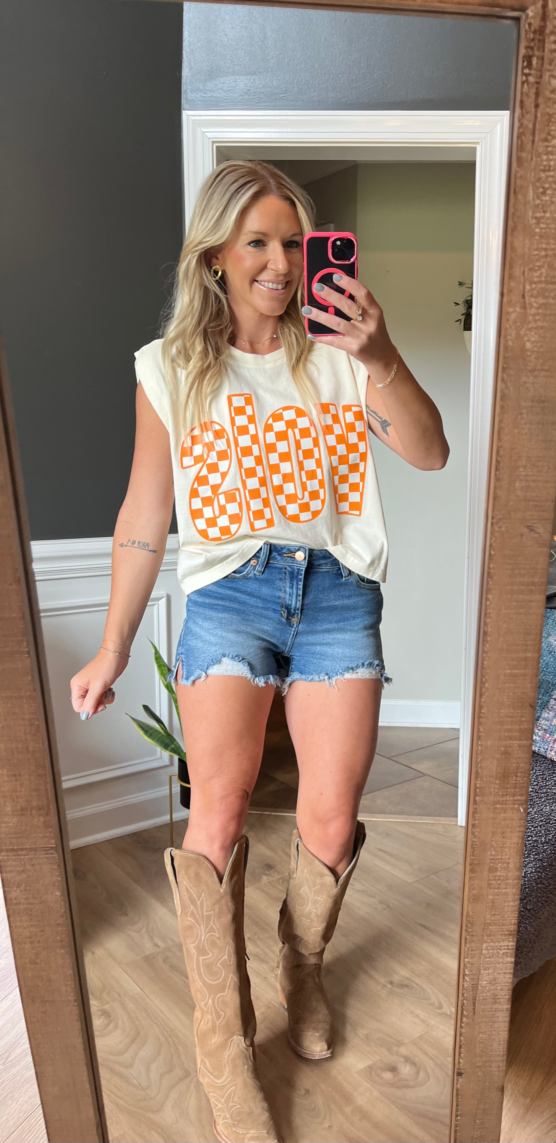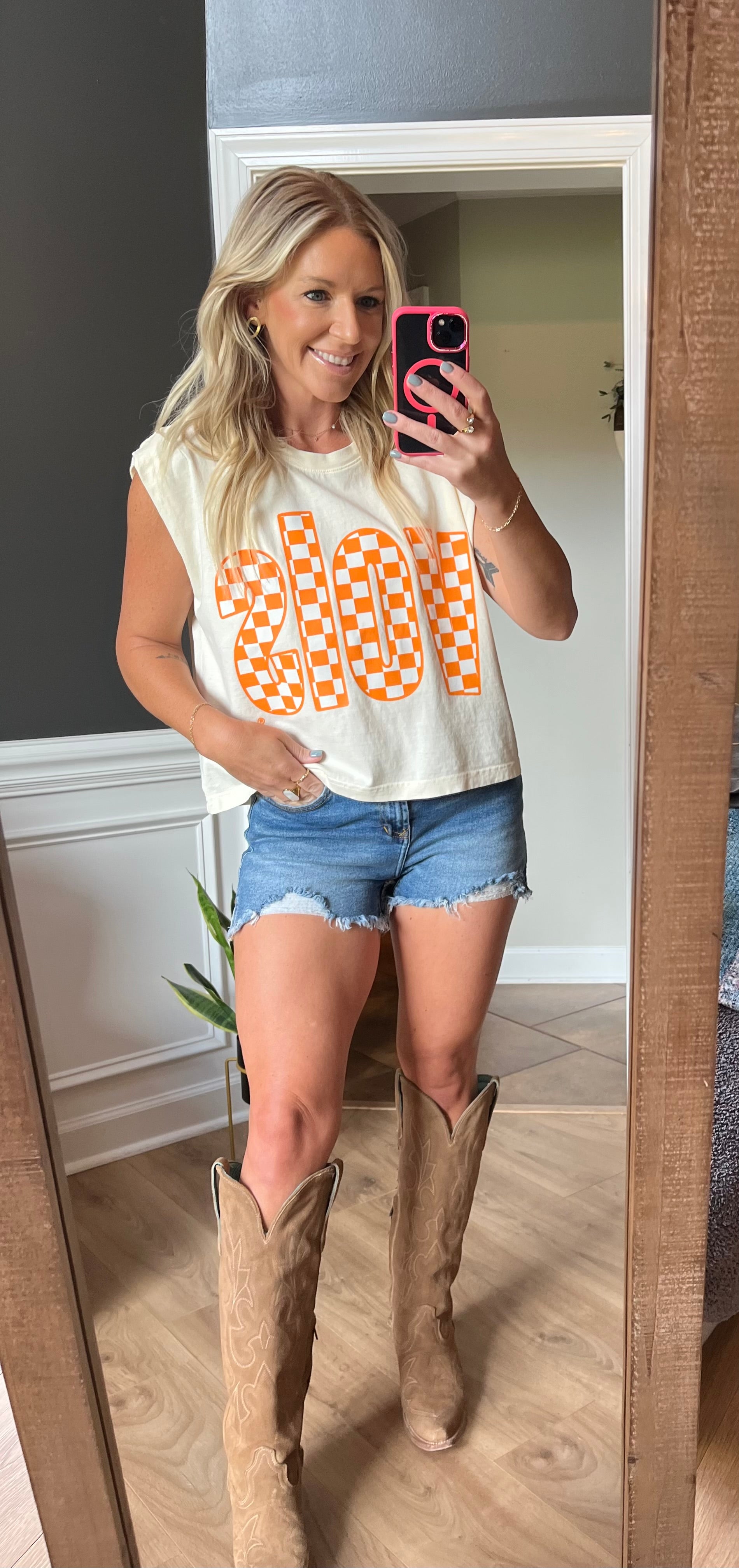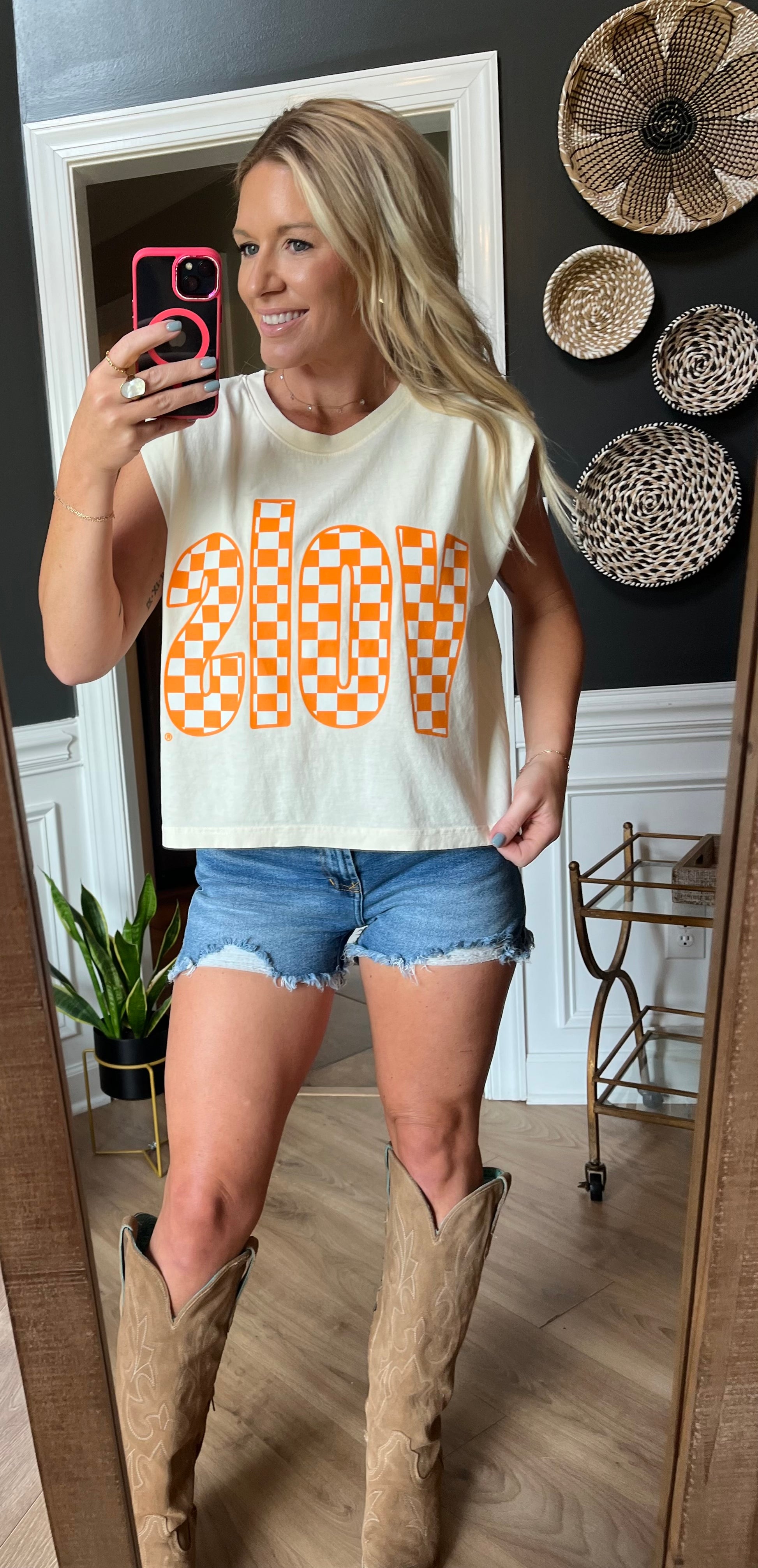 the perfect vintage inspired 90s college muscle tank, oversized fit. Screen printed Checkerboard VOLS
