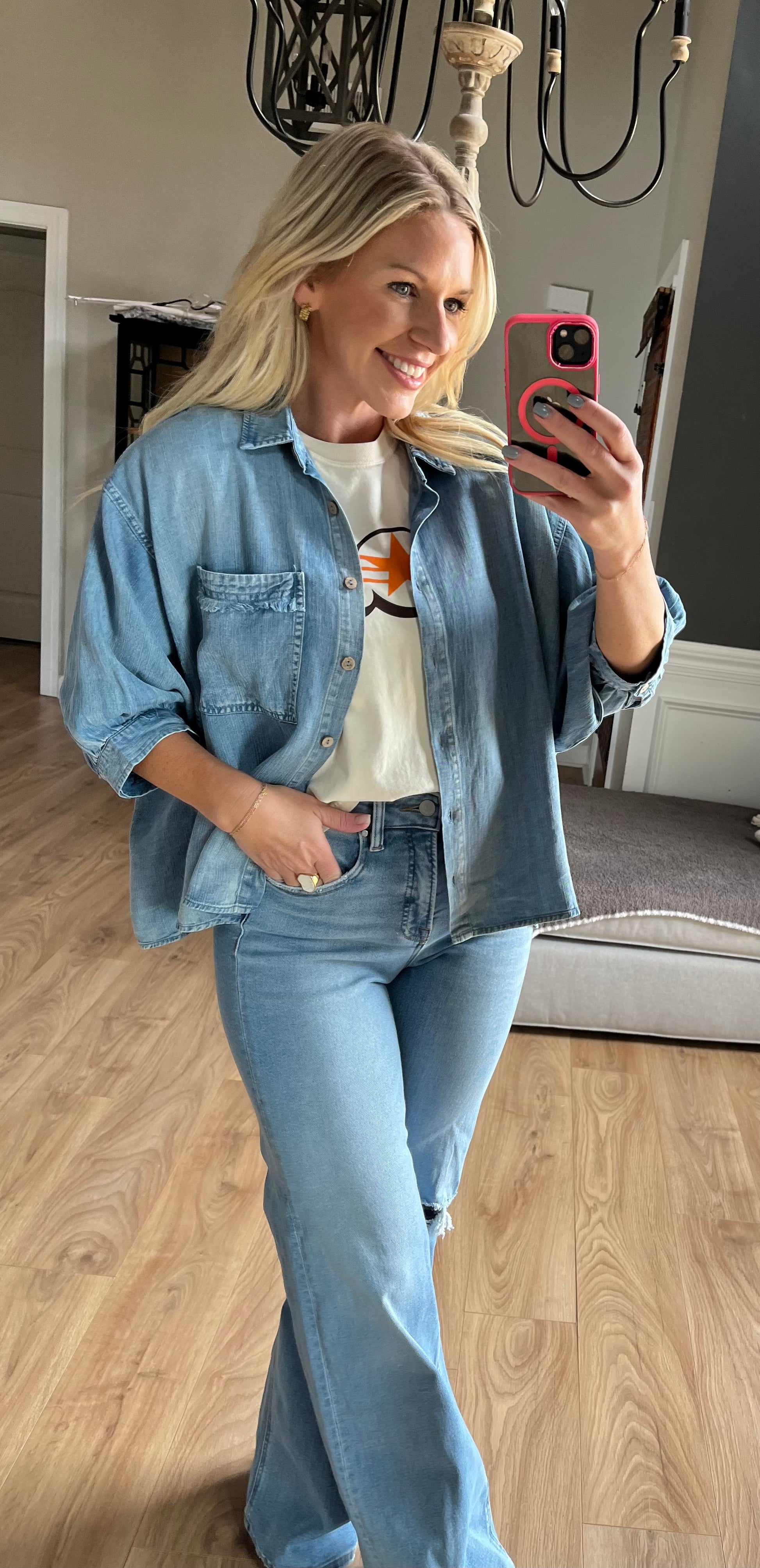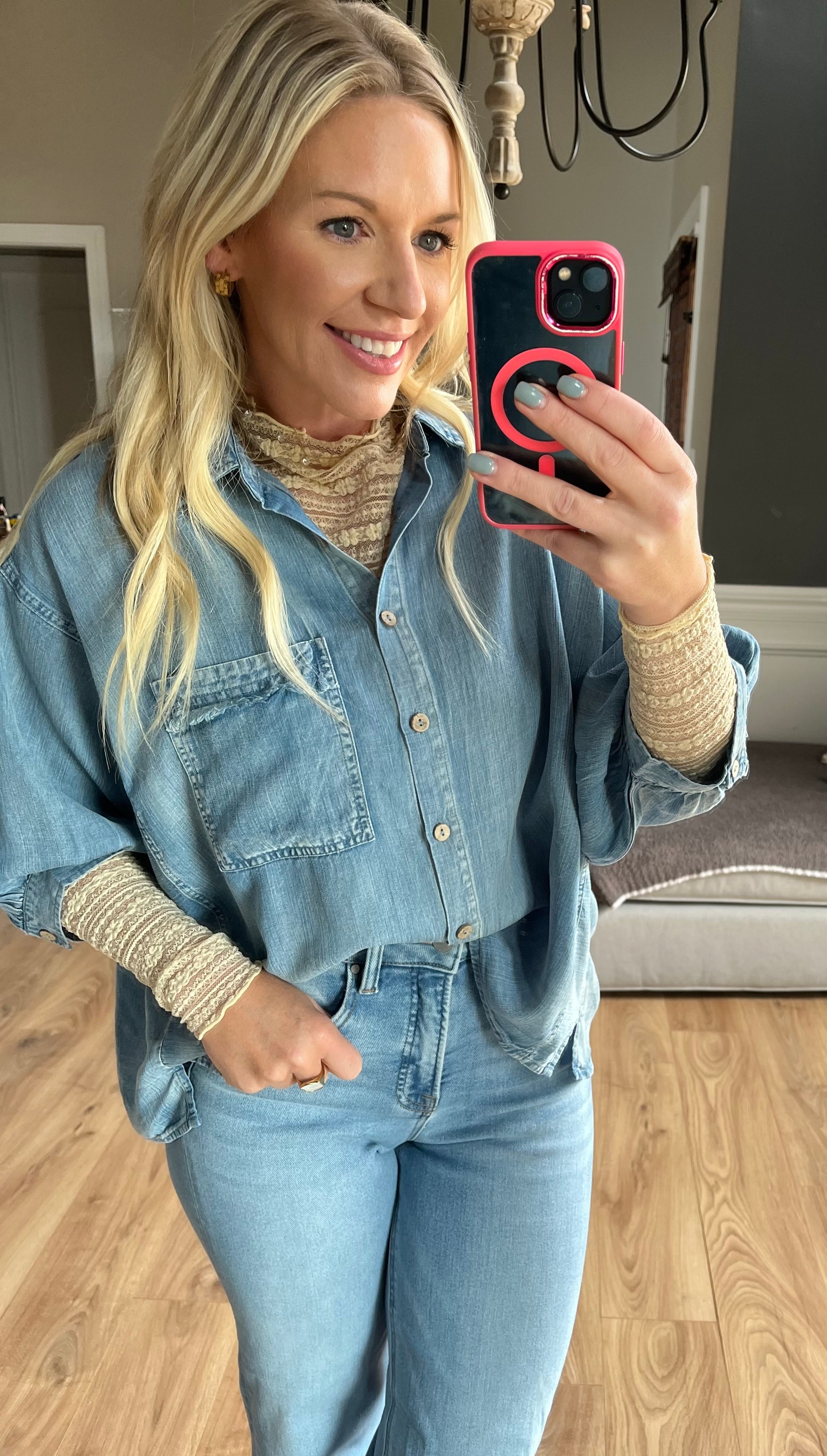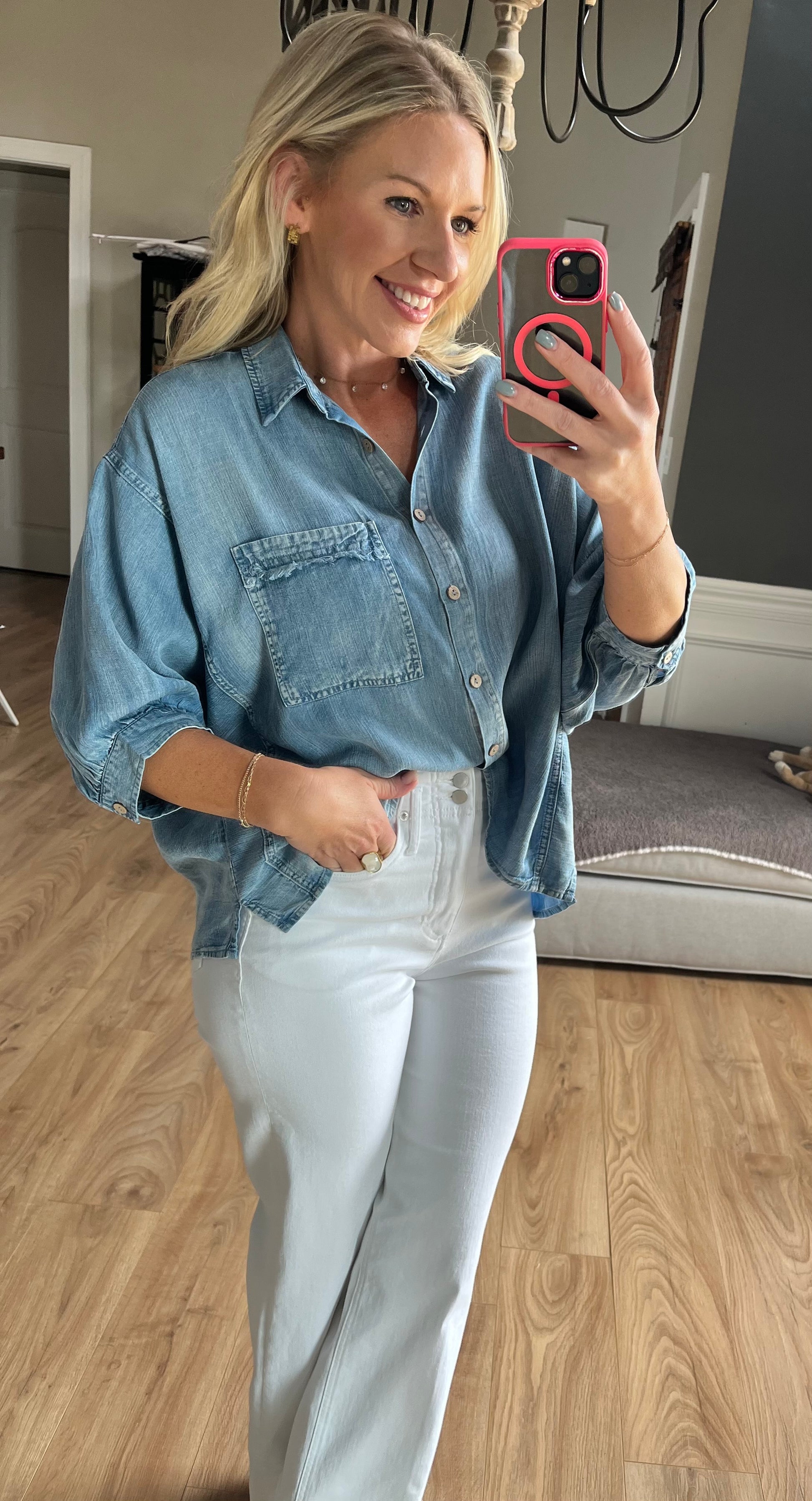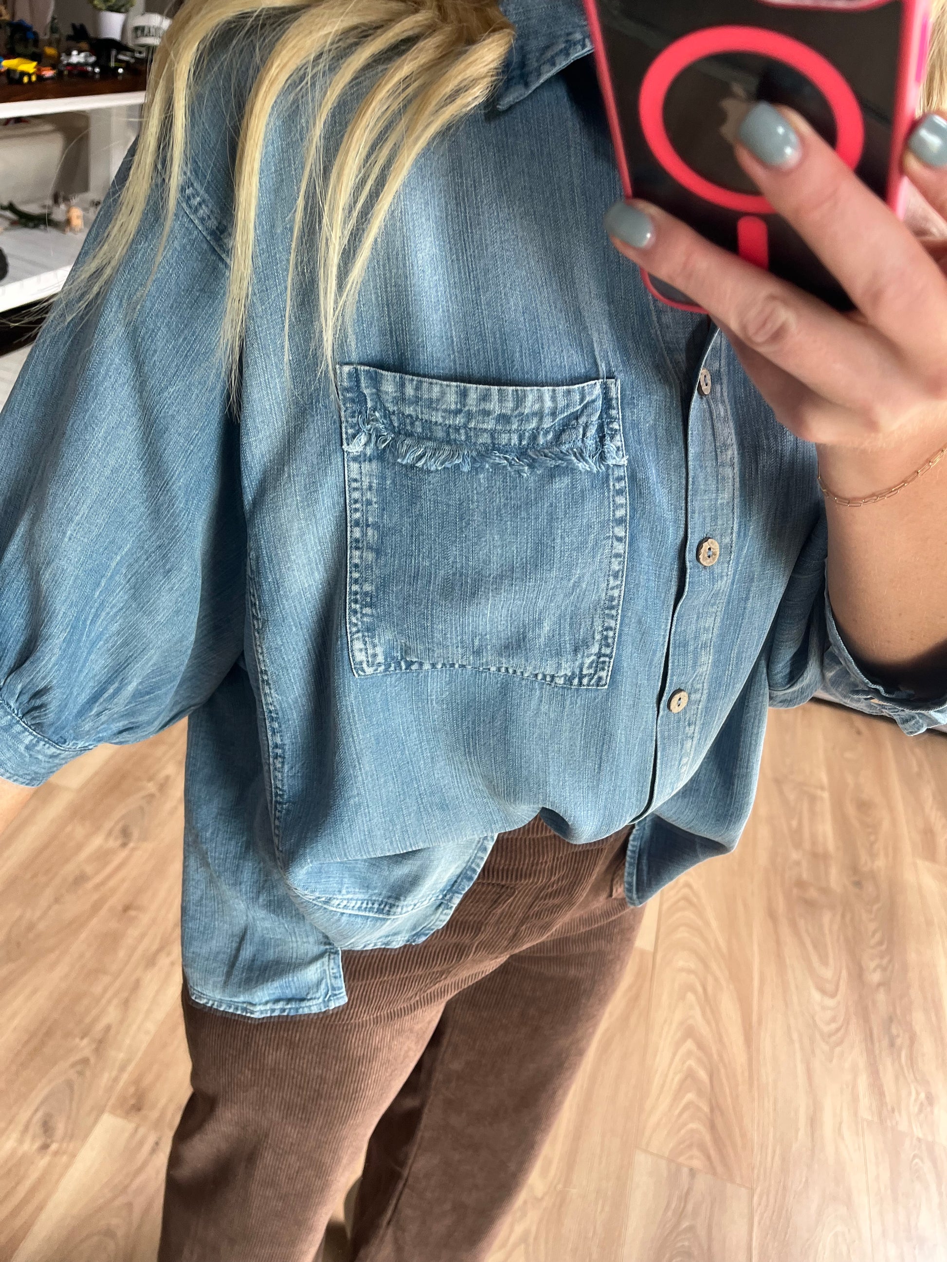 The perfect light weight 3/4 sleeve Tencel denim top !! Frayed detail around trim of front pocket ,
